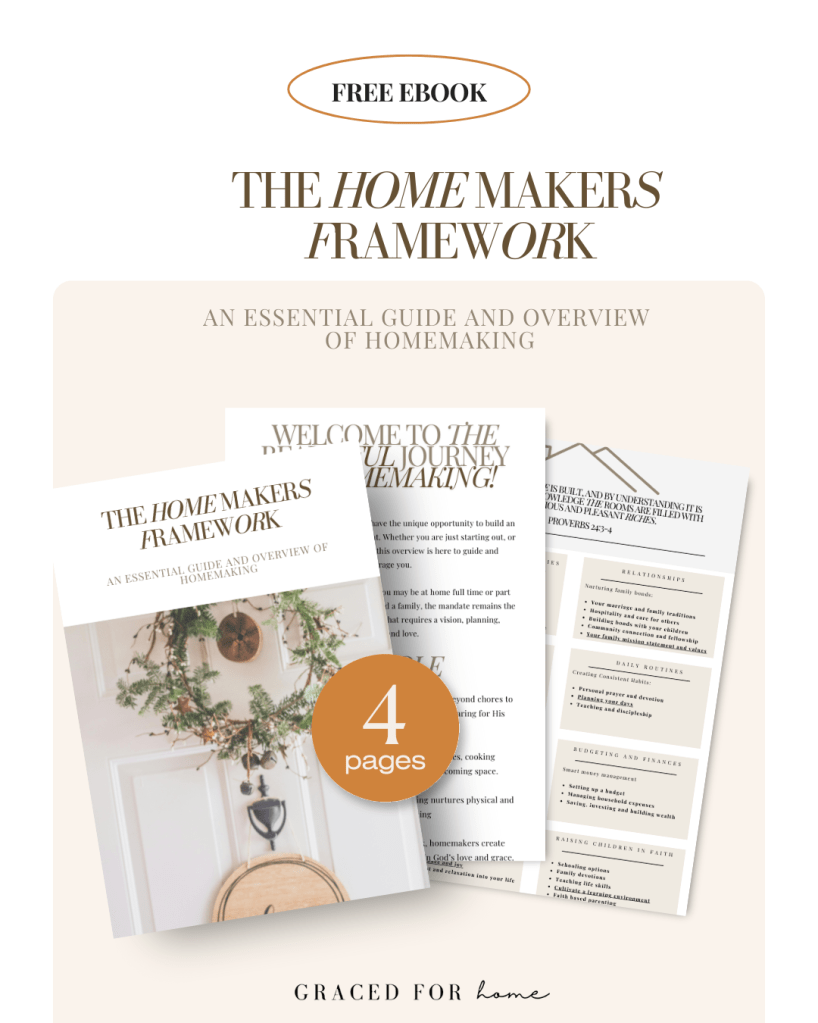 Discover the joy and fulfillment of creating a loving, organised, and faith-filled home! Download my free eBook, “The Homemakers Framework,” for practical tips, encouragement, and inspiration tailored for mothers and homemakers. Start your journey towards mastering home management and nurturing your family’s well-being today. Get your free copy now and transform your home into a sanctuary of love and grace!