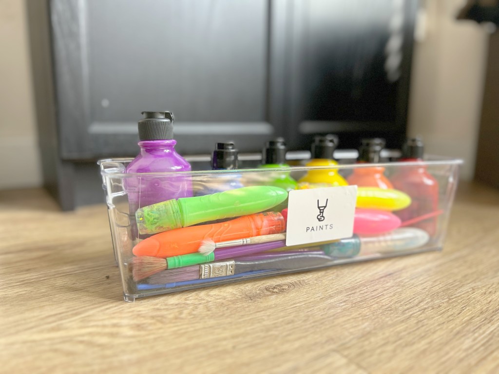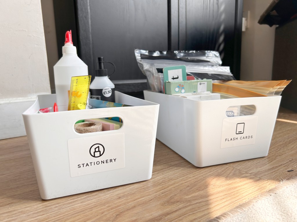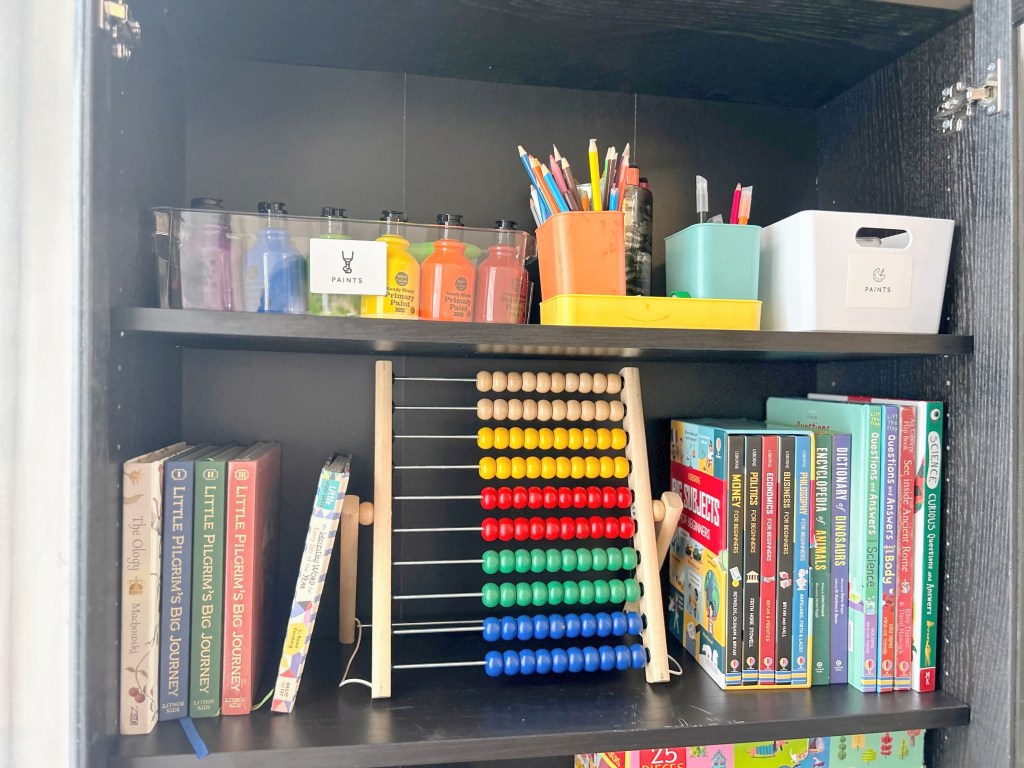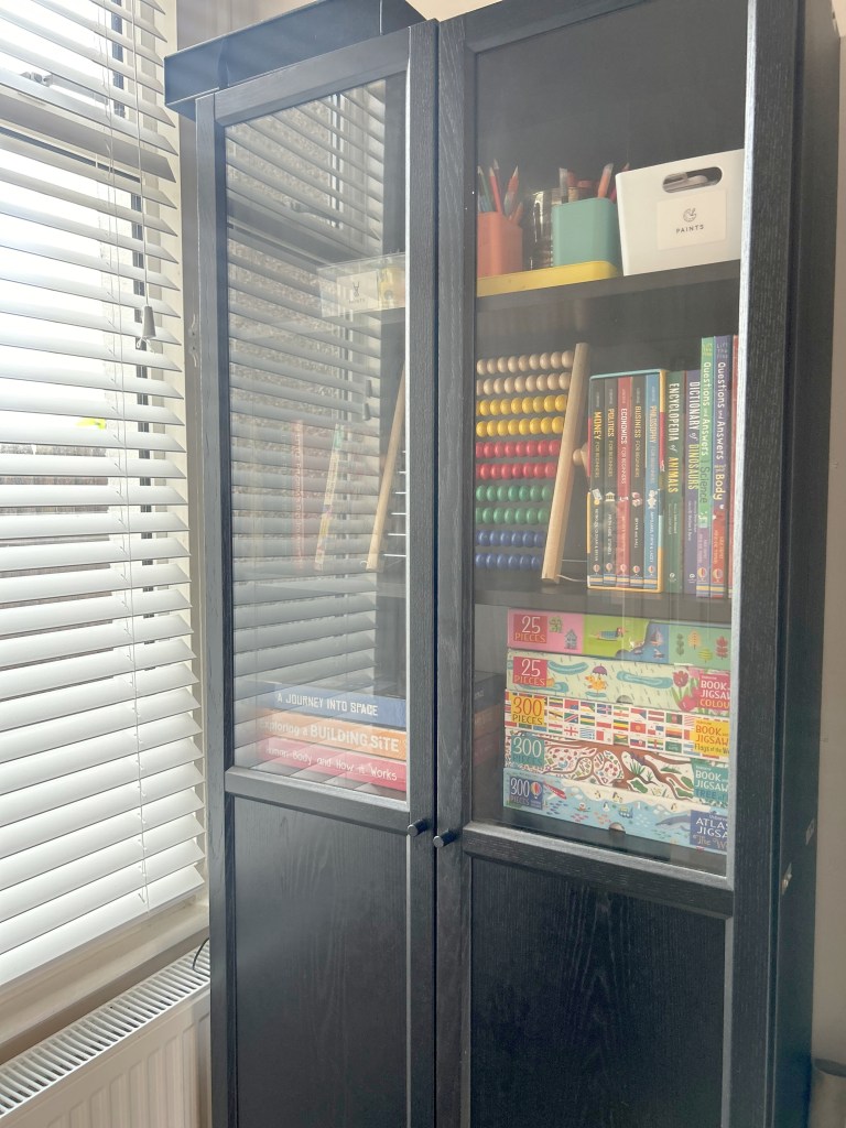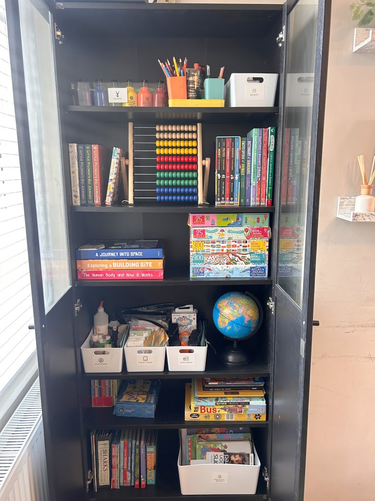 They can be labelled and colour-coded, further enhancing the organisation and allowing for easy rotation of subjects or materials. Additionally, using storage solutions helps maintain a tidy learning environment, which can reduce distractions and create a more focused, productive space for both teaching and learning. This organisation not only streamlines the homeschooling process (allowing you to see exactly the things that you have) but it also instills good habits of tidiness and responsibility in our children.