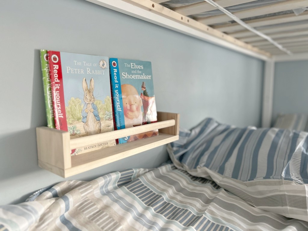 Floating mounted book shelves by each boys sleeping area has been a great addition to the boys room. I wanted to create a private and personal area for them to keep their most favourite books that they could read in bed either in the morning if they wake up early or the evening before they go to sleep.